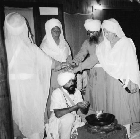 View of Amrit Sanchar from Chile. Both Khalsae Bibian and Singhs are part of the Panj Pyareh administering Amrit to the devotee.