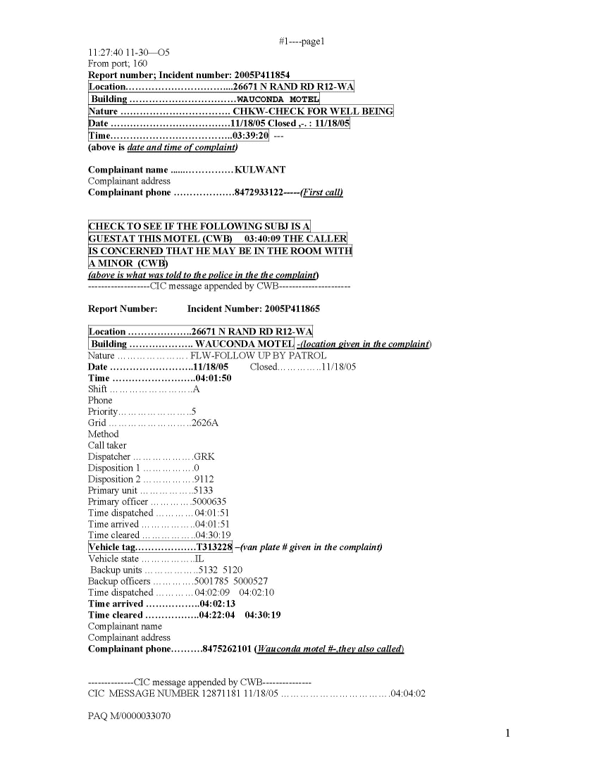 Incident number 2005P41 1865 begins with phone call from an unidentified complainant calling from phone number 847-526-2101 at 4:01:51 AM. Deputy Morrison conducted a follow-up patrol in conjunction with back-up units 5132 and 5120 at 4:02:13 AM. The report describes the location as the Wauconda Motel, 26671 North Rand Road, Route 12, Wauconda, Illinois. (2)
