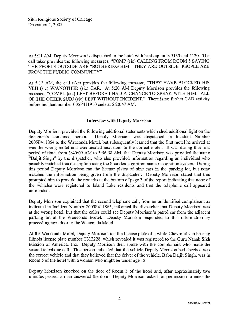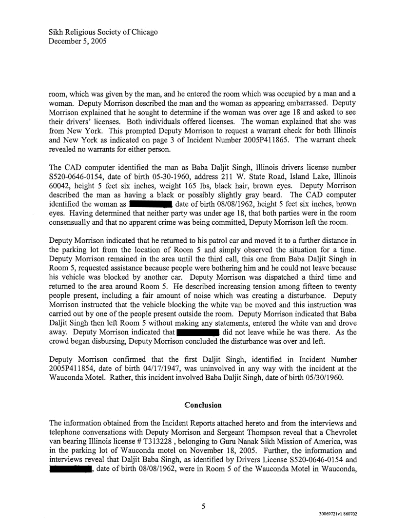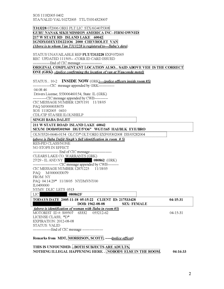 Through their attorney's Hinshaw & Culburtson, LLP the Sikh Religious Society of Chicago obtained various police records and other vital information through interviews and audio transcripts. Panthic Weekly has decided not to reveal the name of Baba's female liaison, in respect to her family and friends, and she is referred to as Ms. X below. The rest of the information is being provided to our readers as is.