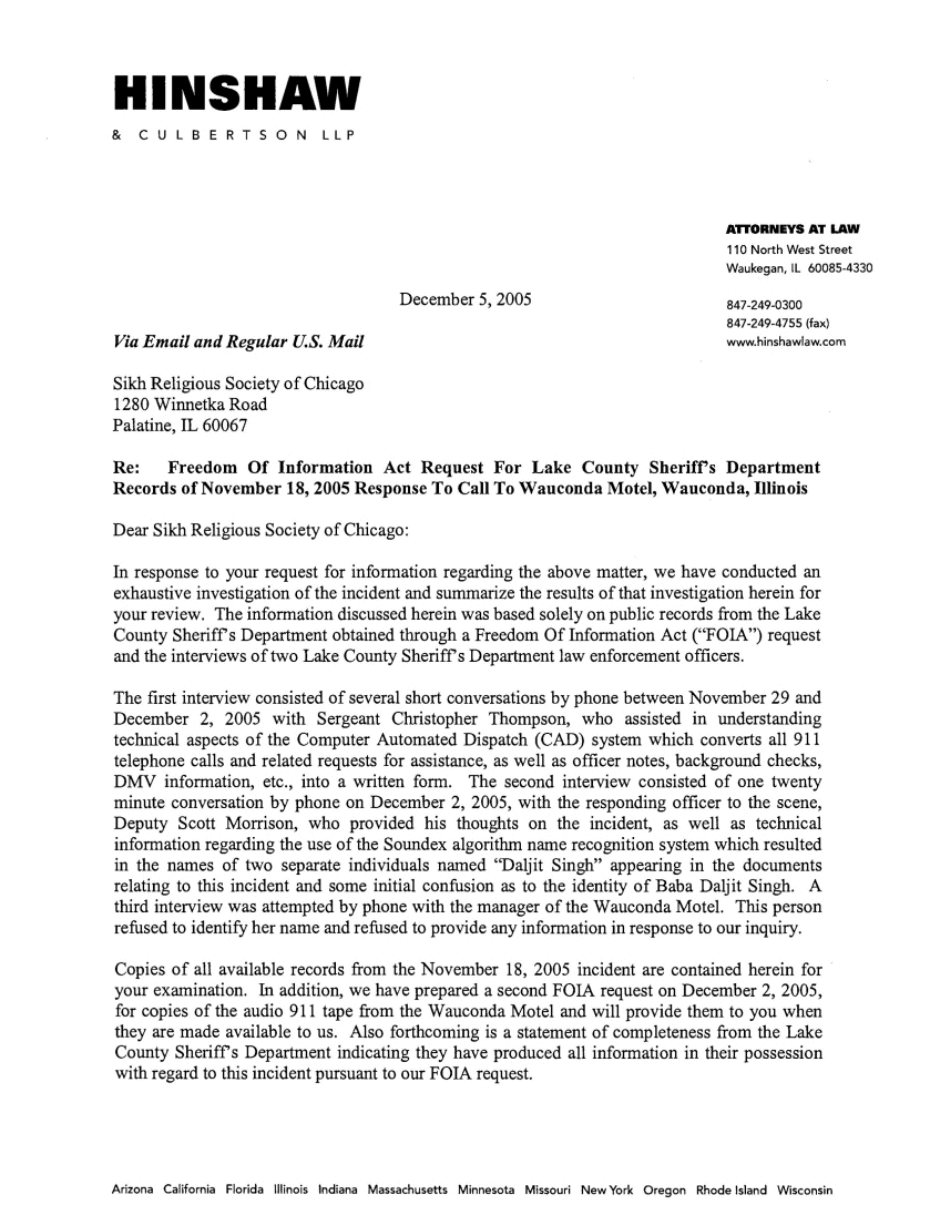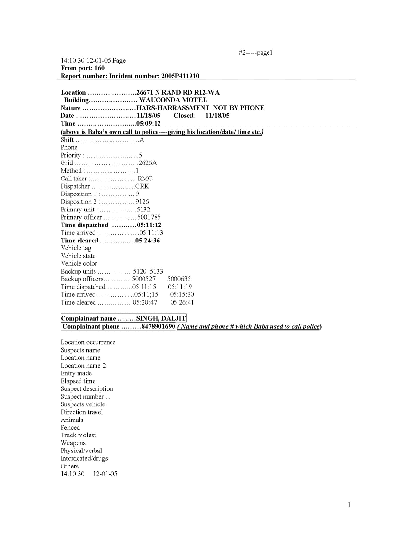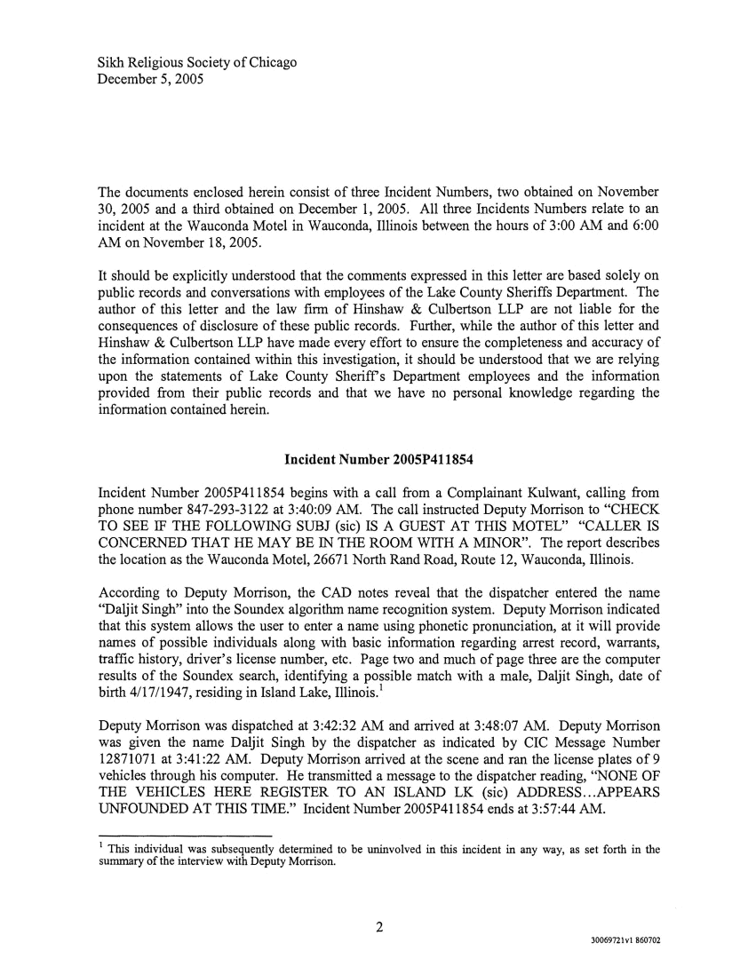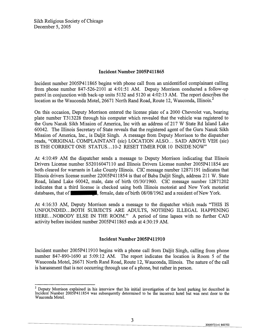 Through their attorney's Hinshaw & Culburtson, LLP the Sikh Religious Society of Chicago obtained various police records and other vital information through interviews and audio transcripts. Panthic Weekly has decided not to reveal the name of Baba's female liaison, in respect to her family and friends, and she is referred to as Ms. X below. The rest of the information is being provided to our readers as is.