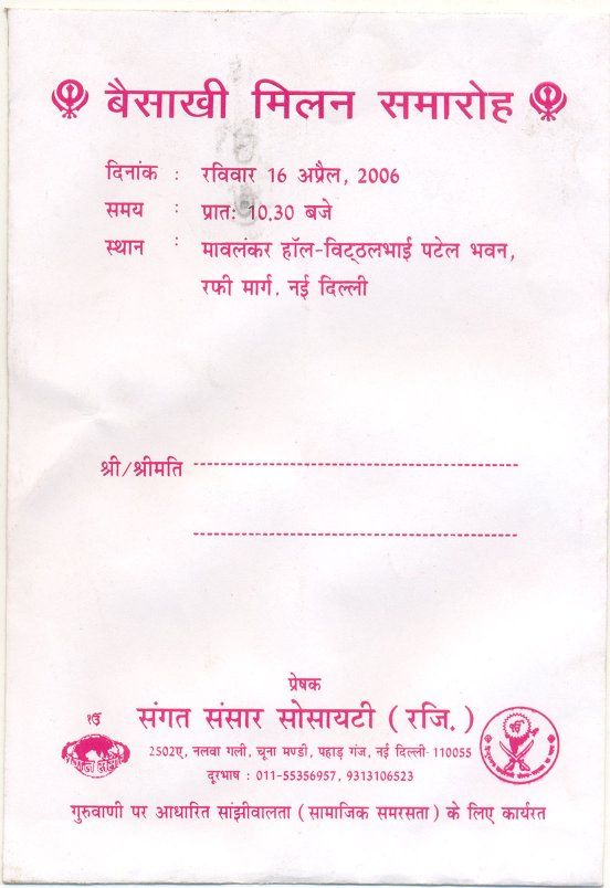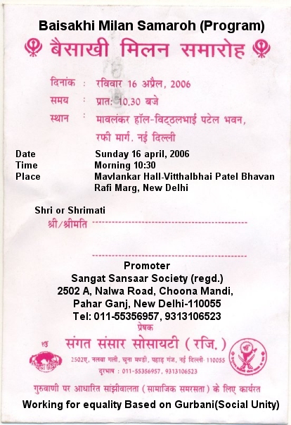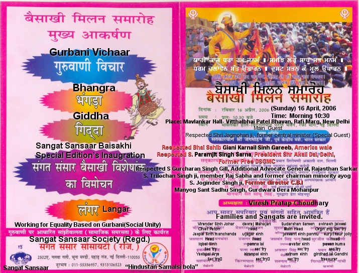 Amritsar Sahib (KP) April 13th, 2006 - In another deliberate attempt to spread its anti-Sikh philosophy, the RSS is organizing a “Vaisakhi” function in which it has openly invited the key leadership of the Delhi Sikh Gurdwara Management Committee to “inaugurate” a special “Vaisakhi” edition of “Sangat Sansar.”, its known instrument of poisonous propaganda. This information was relayed to Panthic Weekly by Panthic organizations, GURSIKH, Shahbaaz Khalsa, and the Khalsa Alliance.