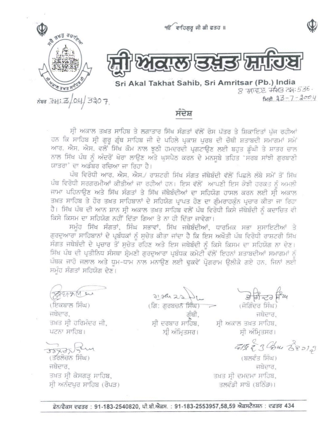 Its a miracle that the jathedar Akal Takhat took such a stand on RSS. We all should ensure that such Sandesh should not be withdrawn by the Jathedar and we should rather issue statements in support of him to give him strength, so that he does not retract from his stand.