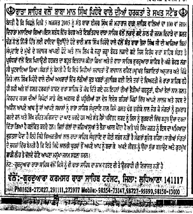 Sant Giani Mohan Singh Ji, the saintly centenarian head of the Bhindra Samperdai, has attained Akal Chalana, leaving his mortal body to merge with Akal Purakh Sahib. The revered Giani Ji headed the religious seminary (Taksal) for over half a century. ...