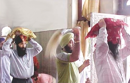 Sevadars doing 'Sukhassan' of saroops inside Hindu mandir