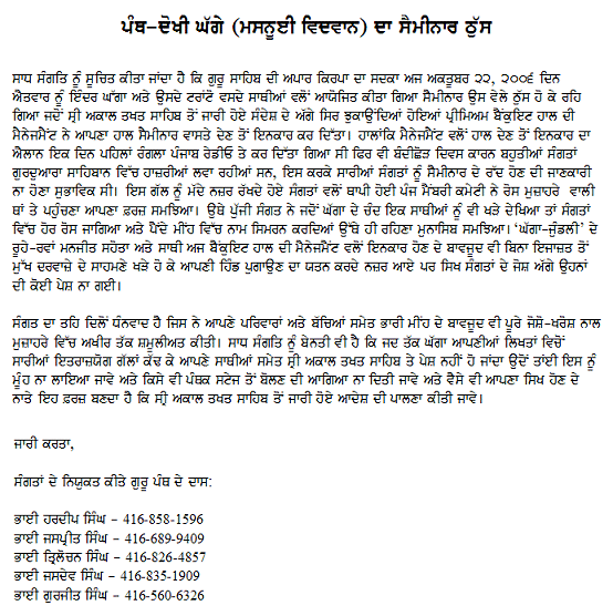 In light of the situation, a statement was later issued by the five-member committee that was constituted by the Panthic organizations. View press statement by the pro-Panthic five-member committee.