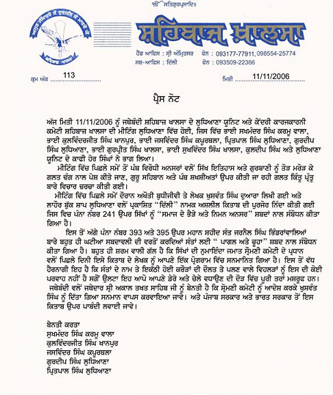 (Shahbazz Khalsa Press Release Regarding Kushwant's Novel Delhi)