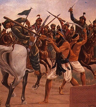 The Mughals had run back in retreat once again. The two Khalsa were lying on the ground with no bone intact. And then the unimaginable happened. The Singhs propped themselves up and on their knees and elbows began to advance towards the enemy again. They glared at the Mughals and would not look away or blink. With their intense gaze they continued their approach. They had no hope for life any longer. Their faces were glowing red. The Mughals were terrified that these two beasts may stand again. The entire army fell upon them and cut their bodies into pieces. The two Singhs were martyred and joined their brothers and sisters in SachKhand.