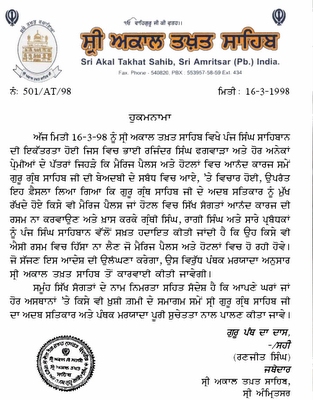 “Those who act in direct conflict to this Hukamnama will face Pesh (penalty) from Sri Akal Takht Sahib.”