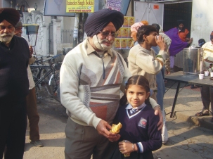 Pritam Bedi handing out idols of Hindu diety Ganesh to Sikh Children for reciting Kirtan at Gurdwara Singh Sabha