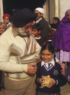 After competition, Pritam Bedi handing out idols of Hindu diety Ganesh to Sikh Children for reciting Kirtan at Gurdwara Singh Sabha
