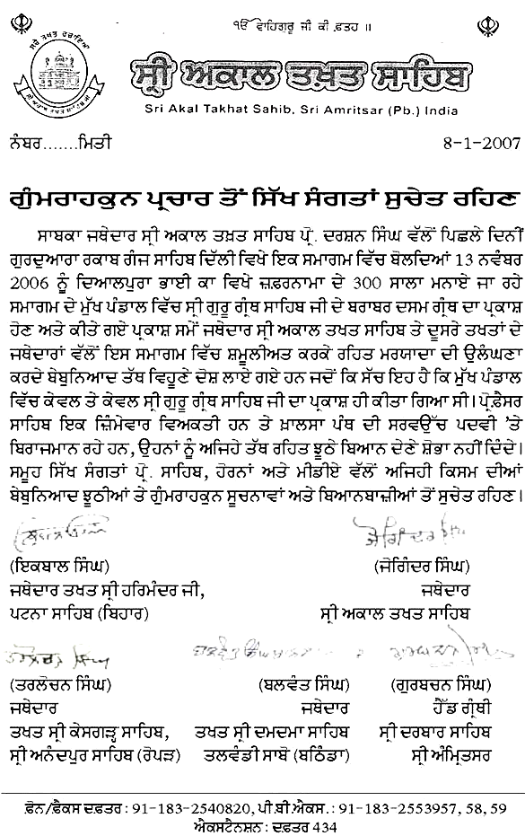 7. Last year, at Dayal Pura Bhai Ka, Bathinda, on the celebrations of Zafarnama day, only the parkash of Guru Granth Sahib was done. Darshan Singh has repeatedly lied that there was also the parkash of Sri Dasam Granth. For this a hukamanama from Akal Takhat Sahib was issued warning sangat to beware of him and his lies.