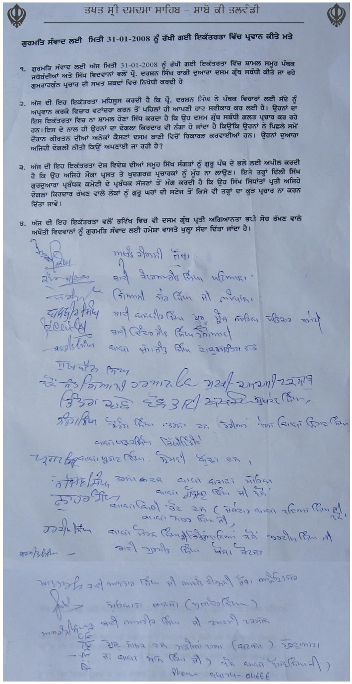 The following Resolutions were passed on January 31, 2008 at Resolutions Passed at Takht Sri Damdam Sahib in regards to the blasphemous comments by Ragi Darshan Singh on Dasam Granth Sahib :