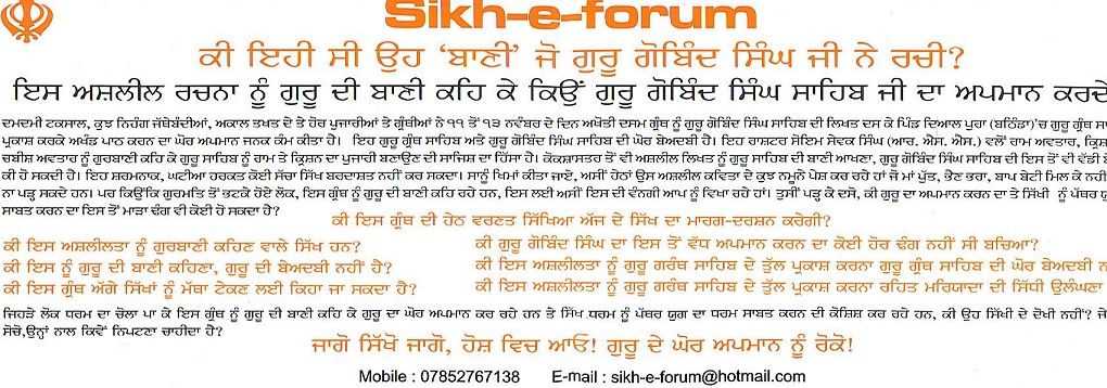Misguided individuals, such as the ones handing out anti-Dasam Bani leaflets should first fully understand the concept and contents of the Dasam Granth Sahib before openly questioning them. There is nothing wrong in raising questions, however posing questions without seeking answers does not do justice. At the same time, Sikh organizations based in United Kingdom and other parts of the world also need to stop this mis-guided parchar.
