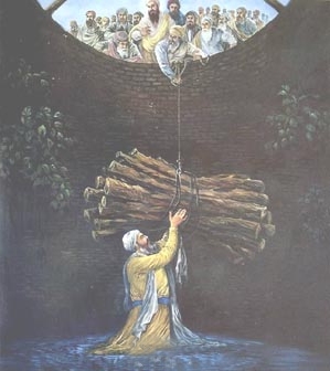 One day early in the morning when Bhai Manjh was going to the langar to give wood, such a dust storm arose that he could see nothing. Bhai Manjh stumbled and fell into a well. He kept the bundle of wood that he had on his head so that it might not get wet. He was not afraid and kept reciting Gurbanee. Day broke and Bhai Manjh still had not returned and everyone understood he must be in trouble. The Sikhs began to search for him, they split up into different groups and searched in every direction. Eventually one search party came near a well and heard someone singing and reciting Gurbanee. When they looked into the well they saw Bhai Manjh standing in the well, keeping dry the wood on his head. One Sikh ran to Guru Arjan Dev Jee to tell him what had happened and Guru jee immediately dashed bare foot to the well. They threw a rope into the well and asked Bhai Manjh to pull himself out. Bhai Manjh jee called from the depth of the well, "Please, first pull the wood out for the langar! If they become wet, they will be of no use and not burn. If I am wet, nothing will happen." Bhai jee tied the wood bundle to the rope and had it pulled out. Only then did Bhai Manjh pull himself out.