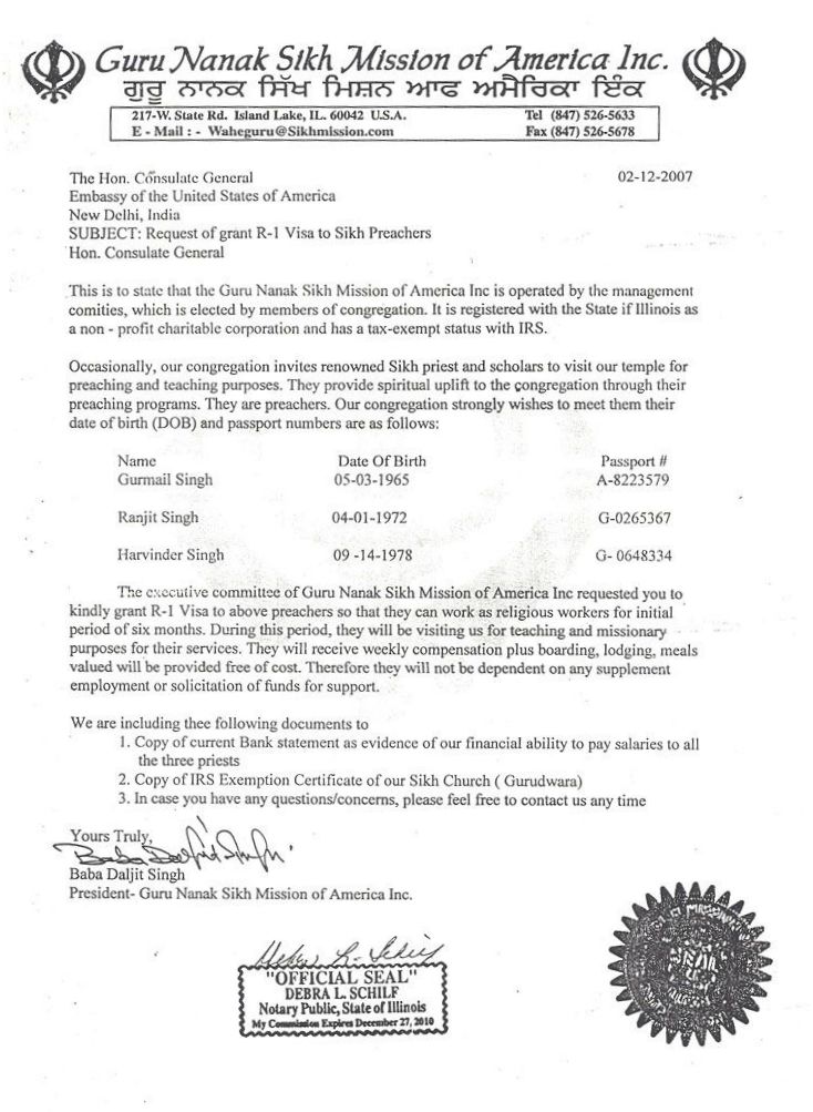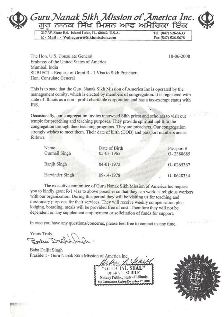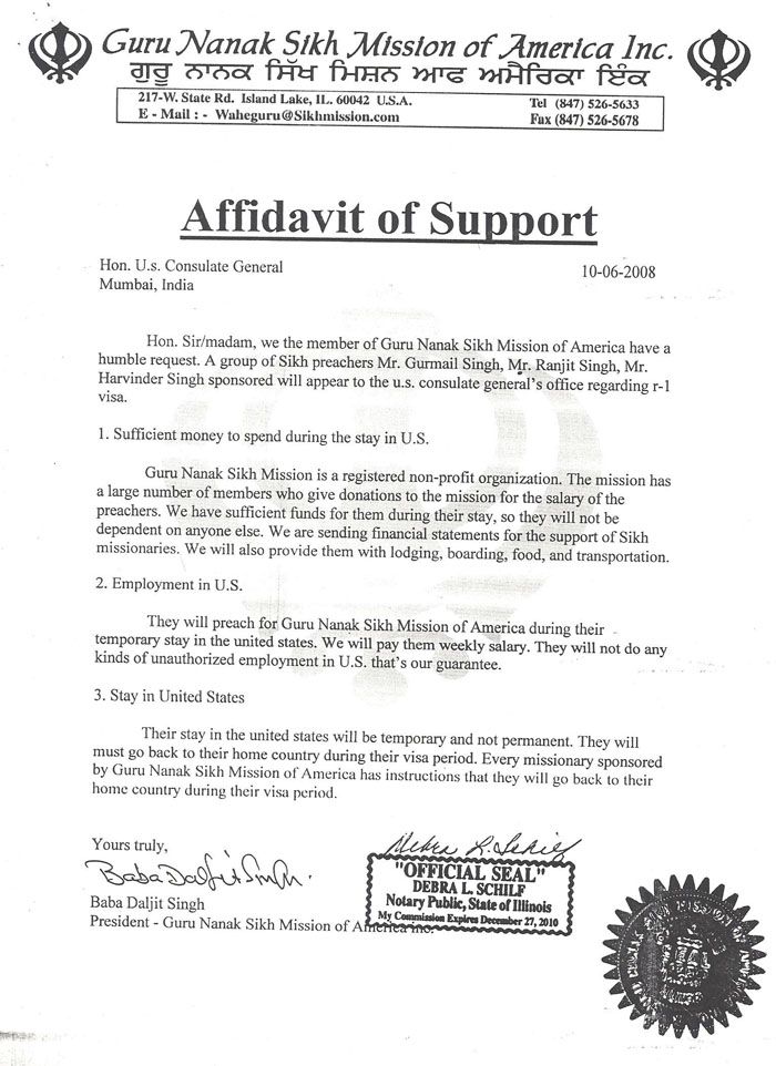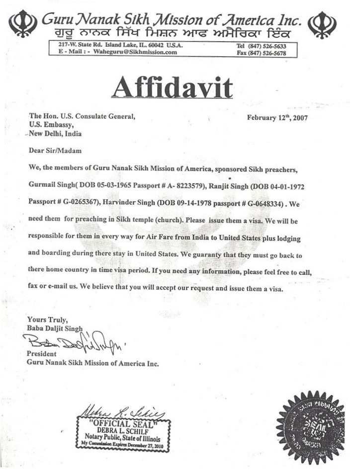 Sponsorship/Affidavits of Support sent by Guru Nanak Mission, Inc.