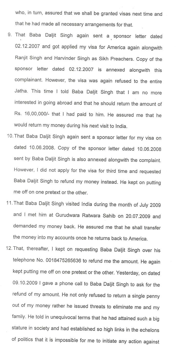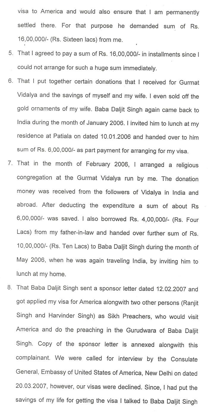 Gurmail Singh alleges that he secured a sum of Rs. 1,600,000 utilizing his life savings and selling family jewellery, and delivered it to the Baba on January 10, of 2006. Since then, Gurmail Singh states, the Baba has not been able to secure him a visa, and has also refused to return the money.