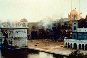 "The Akal Takht, the unique symbol of sovereignty and Sikh struggle constructed by [the] Sixth guru, Guru Hargobind, which later came to acquire the distinction of being the supreme Sikh institution for prayer and politics, was still smoldering."