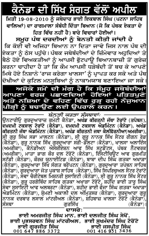 TORONTO, CANADA (KP) - Panthic organizations and Gurdwara Sahibs across North America sharply condemned the August 19th, 2010 divisive decree related to Ragmala by Jathedar Iqbal Singh of Takht Sri Panta Sahib, stating its intent was not in the spirit of Panthic unity.