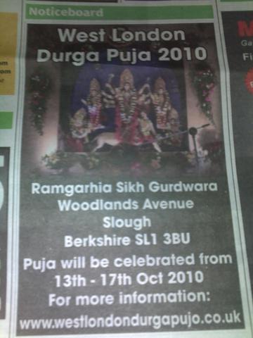 SLOUGH (BERKSHIRE) – Recently the Sikh Sangat discovered that Slough Ramgarhia Gurdwara gave permission for the ‘West London Durga Puja’ group to install idols of Hindu devi devte (deities) in the Gurdwara and perform ‘Puja’. The week long event which took place between 13th to 17th October 2010, was advertised in a local newspaper which came to the attention of concerned Sikhs. According to the ‘West London Durga Puja’ website, this is not the first time the Durga Puja has been performed in the Slough Ramgarhia Gurdwara premises.