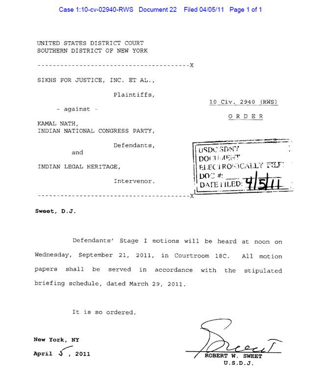 NEW YORK, NY - Judge Robert W. Sweet of the US Federal Court for the Southern District of New York has issued an order setting the pre-trial oral arguments date in case against Congress (I) for their role in November 1984 Sikh Genocide.