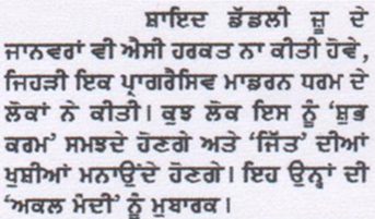 Large animals eat smaller animals and yet Mota Singh claims animals are more civilised than Sikhs who defend their religious institutions from the clutches of corruption and sacrilege! May it be reminded that to save our Gurdwaras from the hands of the corrupt Mahants (caretakers) who were eating meat and drinking meat in the Sikh sacred institutions and used to have dancing girls entertain them, our forefathers went there, protested and sacrificed their lives in order to bring purity and sanctity in the Guru’s institutions. There are many examples like the Saka of Nankana Sahib, Panja Sahib and other many historical Gurdwaras.