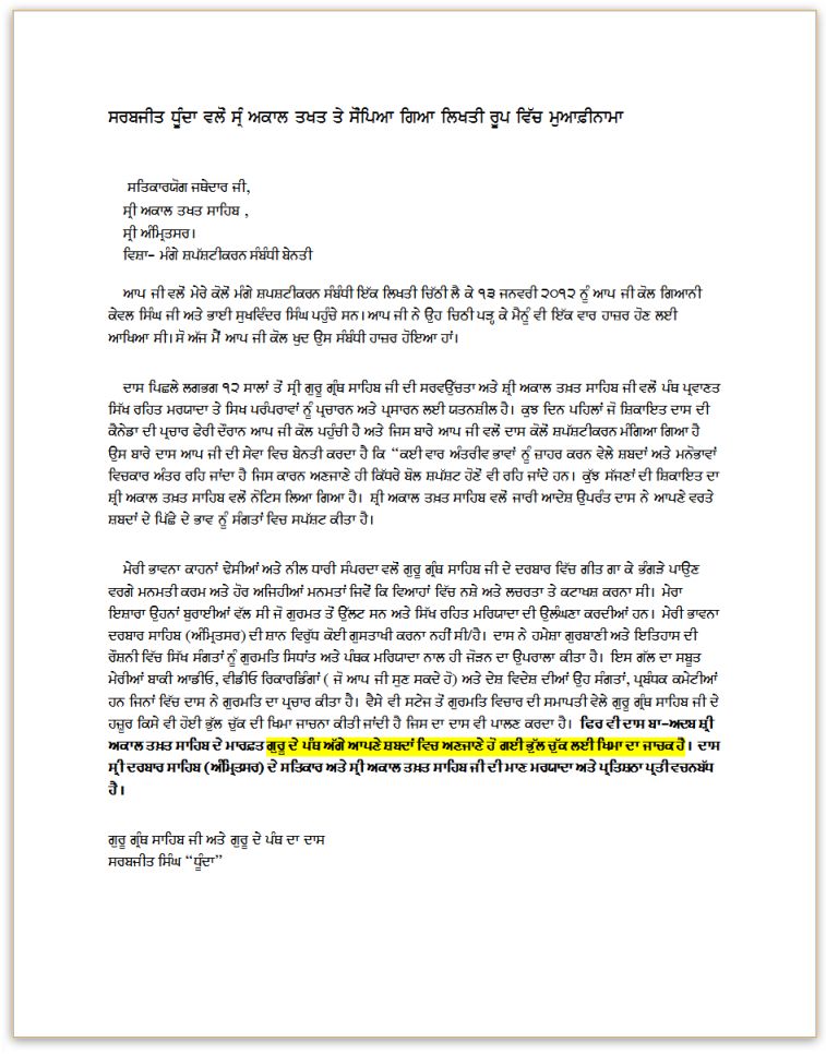 Furthermore, it is clear in the written statement that was submitted by Dhunda that Dhunda clearly apologized when he was summoned at the Takht, here is an extract of that apology: