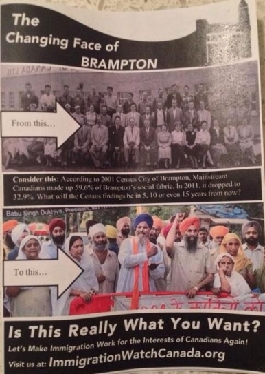 The flyer titled "The Changing Face of Brampton" laments the decreasing proportion of "Mainstream Canadians" in Brampton and contrasts an older picture of a largely Caucasian group with a recent picture of a group of Sikh men and women.