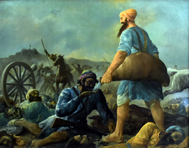 ਭਾਈ ਘਨੱਈਆ ਅਤੇ ਖੜ੍ਹੀ ਤੋਪ ਵਿਚਾਲੇ ਤਿੰਨ ਵਿਅਕਤੀ ਹਨ। ਤਿੰਨੋਂ ਗੰਭੀਰ ਜ਼ਖ਼ਮੀ ਹਨ। ਤਾਹੀਓ ਉਹ ਦੁਸ਼ਮਣ ਹੋਣ ਦੇ ਬਾਵਜੂਦ ਇੱਕ ਦੂਜੇ ਦੇ ਕੋਲ ਅਤੇ ਇੱਕ ਦੂਜੇ ਉੱਪਰ ਪਏ ਹਨ। ਜੋ ਮੁਗ਼ਲ ਬੁੱਕ ਨਾਲ ਪਾਣੀ ਪੀ ਰਿਹਾ ਹੈ ਤਾਂ ਥੋੜ੍ਹੀ ਵਿੱਥ 'ਤੇ ਜ਼ਖ਼ਮੀ ਸਿੰਘ ਆਪਣੀ ਵਾਰੀ ਉਡੀਕ ਰਿਹਾ ਹੈ। ਮਹਿਸੂਸ ਕੀਤਾ ਜਾ ਸਕਦਾ ਹੈ ਕਿ ਕ੍ਰਿਪਾਲ ਸਿੰਘ ਦੇ ਕਿਰਦਾਰ ਠਰੰਮੇ ਵਾਲੇ ਹਨ। ਕਿਸੇ ਵੱਲੋਂ ਅਜਿਹੀ ਕੋਈ ਹਰਕਤ ਨਹੀਂ ਹੋ ਰਹੀ ਜੋ ਚਿਤਰਿਤ ਚੌਗਿਰਦੇ ਨੂੰ ਸ਼ੋਰੀਲਾ ਕਰਦੀ ਹੋਵੇ। ਇੱਥੋਂ ਤਕ ਕਿ ਪਿਆਸੇ ਅਤੇ ਜ਼ਖ਼ਮੀ ਸਿਪਾਹੀਆਂ ਨੇ ਵੀ ਧੀਰਜ ਧਾਰਿਆ ਹੋਇਆ ਹੈ। ਚਿਤੇਰਾ ਆਪਣੇ ਚਿਤਵੇ ਨੇਮ ਦਾ ਅਨੁਸਰਨ ਕਰ ਰਿਹਾ ਹੈ।
