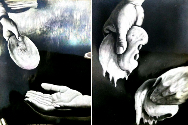 ਲਖਾਇਕ ਵੀ ਹੈ। ਹੱਥਾਂ ਦੇ ਉਭਾਰ ਦੇ ਪਿਛੋਕੜ ਵਿੱਚ ਕੋਈ ਆਕਾਰ ਨਹੀਂ, ਬਸ ਸੰਘਣੇ ਗੂੜ੍ਹੇ